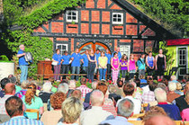 Die Speelkoppel Hoyerswege konnte ihren Freiluft-Auftritt bei schönstem Sonnenschein absolvieren. Auch die Kindergruppe appellierte musikalisch: „Snack mal wedder Platt!“