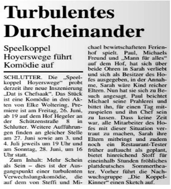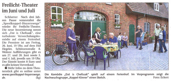 Nach der Premiere am Freitag tritt die Speelkoppel Hoyerswege auf dem Hof Hegeler in Schlutter, Schützenstraße 8, auch am Sonnabend um 19 Uhr und am Sonntag um 16 Uhr unter freiem Himmel auf. Vor der Komödie „Dat is Chefsaak“ sind jeweils die „Koppel-Kinner“ zu sehen.