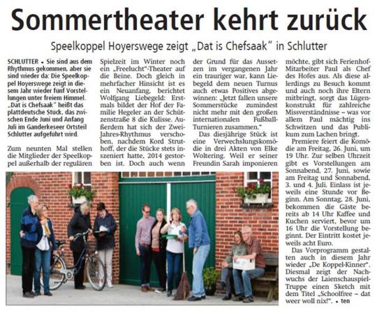 Schlutter. Die Speelkoppel Hoyerswege hat am Freitagabend, 26. Juni 2015, erstmals das Stück „Dat is Chefsaak“ gezeigt. Davor präsentierten die Koppel-Kinner einen plattdeutschen Sketch.