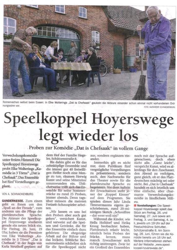Bereits zum neunten Mal bringt die Speelkoppel Hoyerswege ein plattdeutsches Theaterstück auf eine Freilichtbühne. Etwa 30 Leute arbeiten momentan am Feinschliff für das anderthalbstündige Stück „Dat is Chefsaak“. Premiere feiert der Dreiakter am Freitag, 26. Juni, auf dem Hof Hegeler, Schützenstraße 8, in Schlutter.