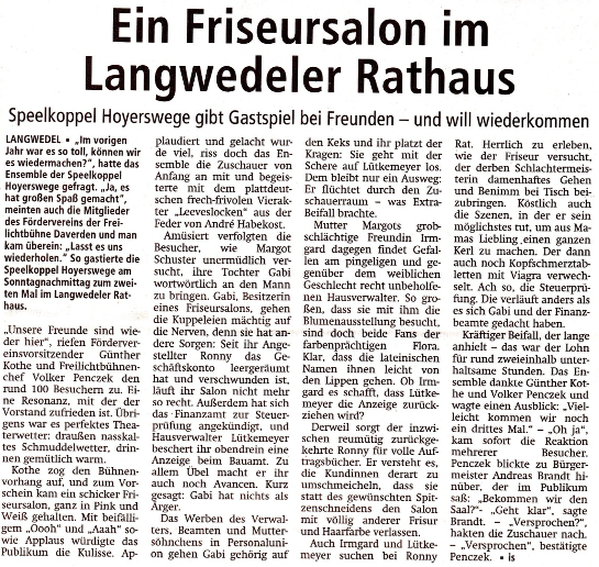 47. Vorstellung – und brachte die Lachmuskulatur ihrer Zuschauer in Bewegung. „Leeveslocken“ heißt das aktuelle Stück der Hoyersweger, das erstmals in einem Friseursalon spielt. Das Stück sei ein