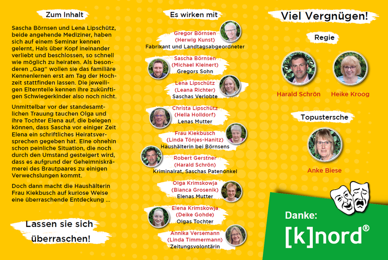 Sascha Börnsen und Lena Lipschütz, beide angehende Mediziner, haben sich auf einem Seminar kennen gelernt, Hals über Kopf ineinander verliebt und beschlossen, so schnell wie möglich zu heiraten. Als besonderen „Gag“ wollen sie das familiäre Kennenlernen erst am Tag der Hochzeit stattfinden lassen. Die jeweiligen Elternteile kennen ihre zukünftigen Schwiegerkinder also noch nicht von Angesicht. Unmittelbar vor der standesamtlichen Trauung tauchen Olga Krimskowja und ihre Tochter Elena auf, die belegen können, dass Sascha vor einiger Zeit Elena ein schriftliches Heiratsversprechen gegeben hat. Eine ohnehin schon peinliche Situation, die noch durch den Umstand gesteigert wird, dass es aufgrund der Geheimniskrämerei des Brautpaares zu einigen Verwechslungen kommt. Doch dann macht die Haushälterin Frau Kiekbusch auf kuriose Weise eine überraschende Entdeckung…..??